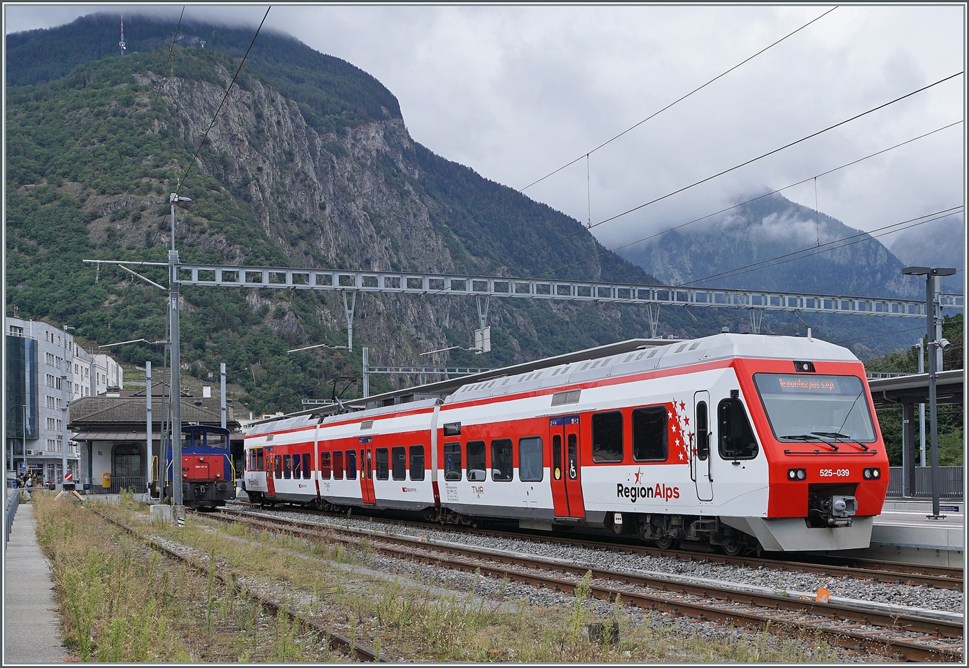 In Martigny wendet der TMR Region Alpes RABe 525 039 für die Rückfahrt nach Le Châble und ein TMR Region Alpes Domino verlässt den Bahnhof in Richtung Brig.