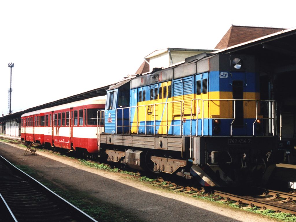 742 454-2 und zwei Beiwagens von die Triebwagens der BR 820 (020 284-6 und 020 001-4) mit Os 5403 Liberec-Jaromer auf Bahnhof Liberec am 20-7-2005. Bild und scan: Date Jan de Vries. Date Jan de Vries
