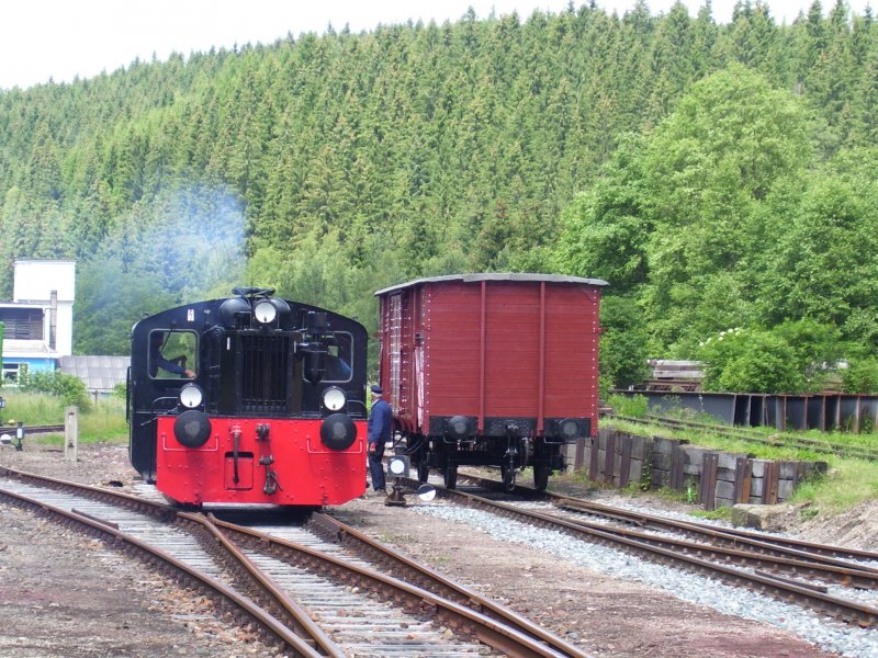Die Kö 100 117-1 rangiert am 24.06.07 mit einem G10 im Bahnhof  Schönheide Süd.  Nach dem umsetzen wird der Güterwagen auf den Rollwagen gedrückt.
