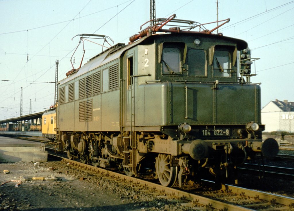 Die sechs bei der DB verbliebenen E 04 waren die einzigen Altbau-E-Loks,die über einen längeren Zeitraum - von 1968 bis 1982 - im nordwestdeutschen Raum stationiert waren. In den letzten Jahren vor ihrer Ausmusterung wurden die Osnabrücker 104 auch gerne vor Sonderzüen eingesetzt, wie hier 104 022-9, die 1980 den Dortmunder Hauptbahnhof verläßt.