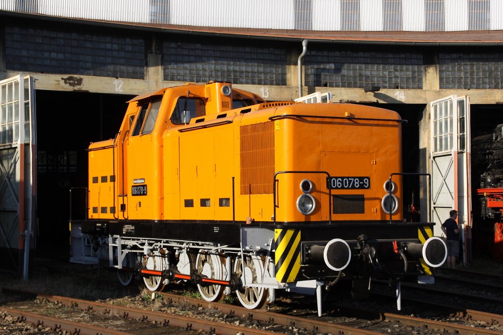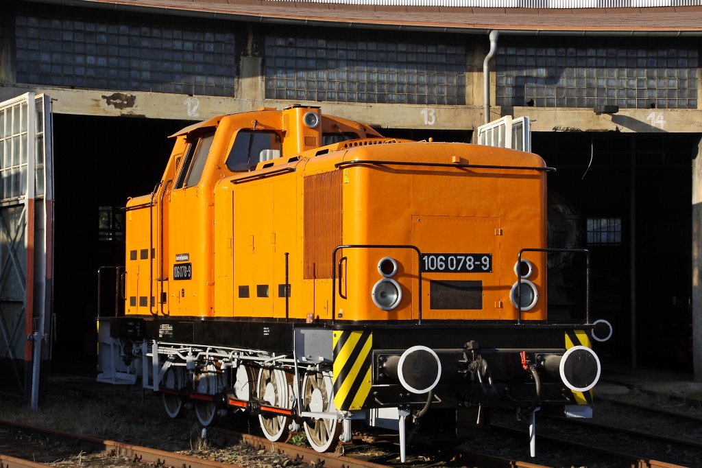 106 078-9 vor dem großen Rundschuppen am 16.09.2012 im Bw Falkenberg Oberer Bahnhof. Es handelt sich hier um eine V 60D der  0 Serie . Das Gelände dient nur zur Aufbewahrung von Fahrzeugen und ist nur an wenigen Tagen im Jahr zugänglich.