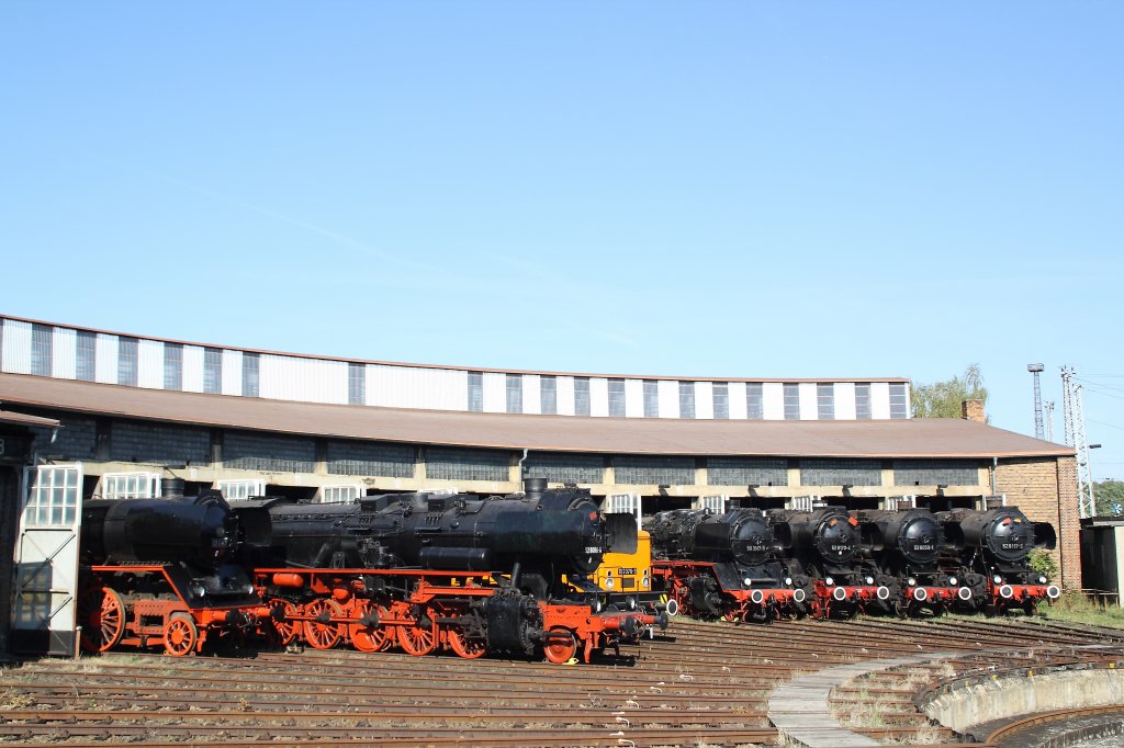 22 047, 52 8089-6, 106 078-9, 50 3517-5, 52 8170-4, 52 8058-1 und 52 8117-5 vor dem großen Rundschuppen am 16.09.2012 im Bw Falkenberg Oberer Bahnhof. Das Gelände dient nur zur Aufbewahrung von Fahrzeugen und ist nur an wenigen Tagen im Jahr zugänglich.