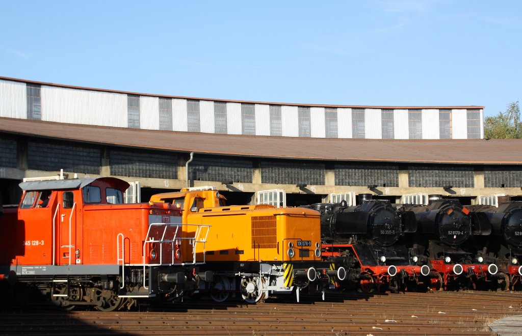 345 128-3 und 106 078-9 vor dem großen Rundschuppen am 16.09.2012 im Bw Falkenberg Oberer Bahnhof. Das Gelände dient nur zur Aufbewahrung von Fahrzeugen und ist nur an wenigen Tagen im Jahr zugänglich.