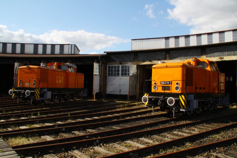 Eine nicht beschilderte DR V 60 und die 106 078-9 standen am 12.09.09 vor dem Lokschuppen des ehemaligen BW Falkenberg oberer Bahnhof. Zur Zeit ist die Anlage nur an wenigen Tagen im Jahr zugänglich, hier soll aber in Zukunft ein Eisenbahnmuseum entstehen.