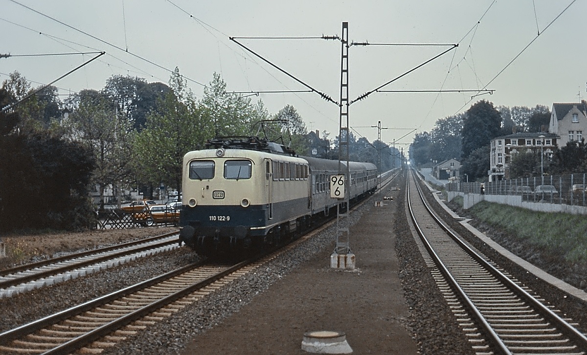 Aus Richtung Wuppertal kommend ist 110 122-9 im Juni 1987 die Rampe von Hochdahl hinabgefahren und durchfährt den 82 m tiefer gelegenen Bahnhof Erkrath Horst Lüdicke