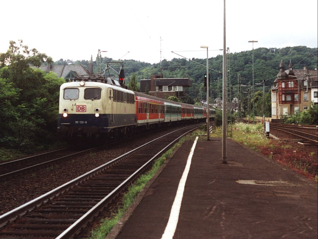 110 132-8 mit RegionalExpress RE 11215 Wuppertal-Oberhausen-Koblenz auf Bahnhof Andernach am 20-7-2000. Bild und scan: Date Jan de Vries. Date Jan de Vries