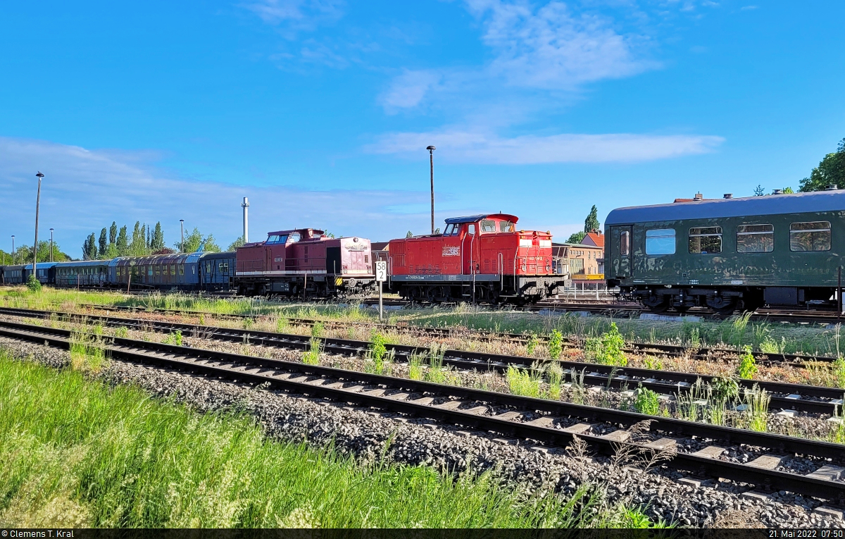 298 135-5 (201 135-1 | 110 135-1 | DR V 100 135) macht sich beim 32. Verkehrshistorischen Wochenende in Aschersleben für Führerstandsmitfahrten bereit und löst damit die 312 167-0 (102 167-4) ab, die im Hintergrund ganz klein zu sehen ist.