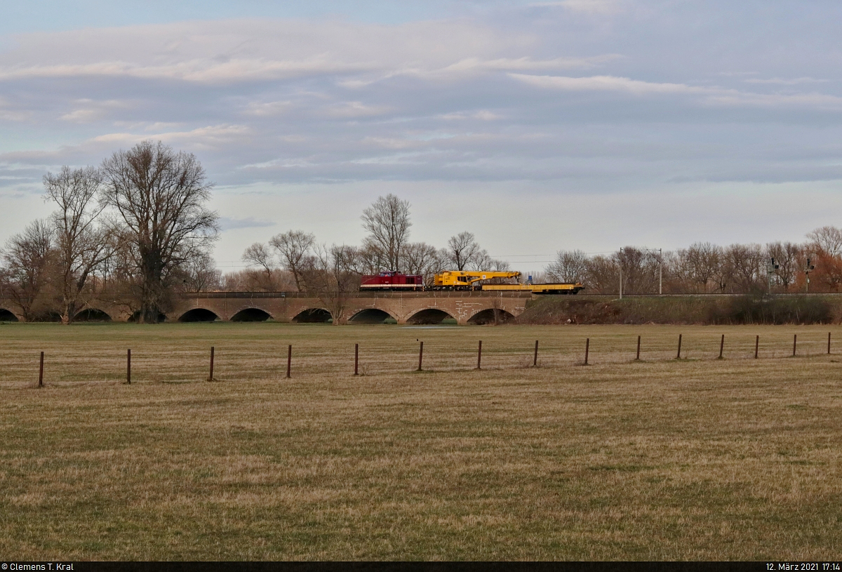 202 237-4 (204 237-2 | 112 237-3 | 110 237-5 | DR V 100.1) fährt mit einem Eisenbahnkran Kirow Multi Tasker (Nummer nicht bekannt) und dazugehörigem Kranwagen über die Steinlache bei Schkopau Richtung Halle-Ammendorf.