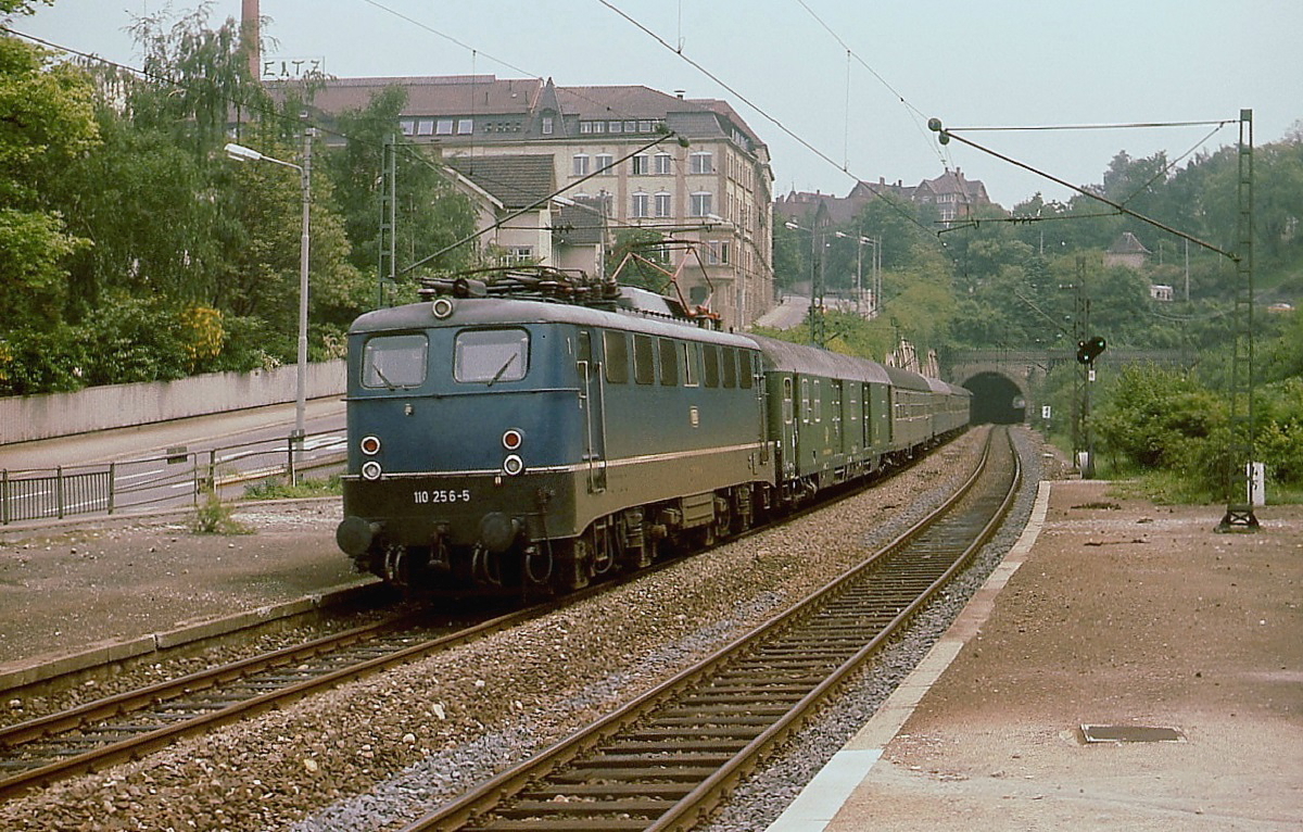 Im Mai 1978 durchfährt 110 256-5 mit einem Eilzug den Bahnhof Stuttgart-Feuerbach. Zu diesem Zeitpunkt waren oft noch Postwagen in diese Züge eingestellt. Horst Lüdicke