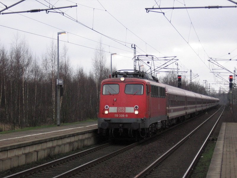 110 339-9 mit einem aus Euro-Express Wagen gebildeten Sonderzug nach Dänemark am 4.02.2007 in Elmshorn