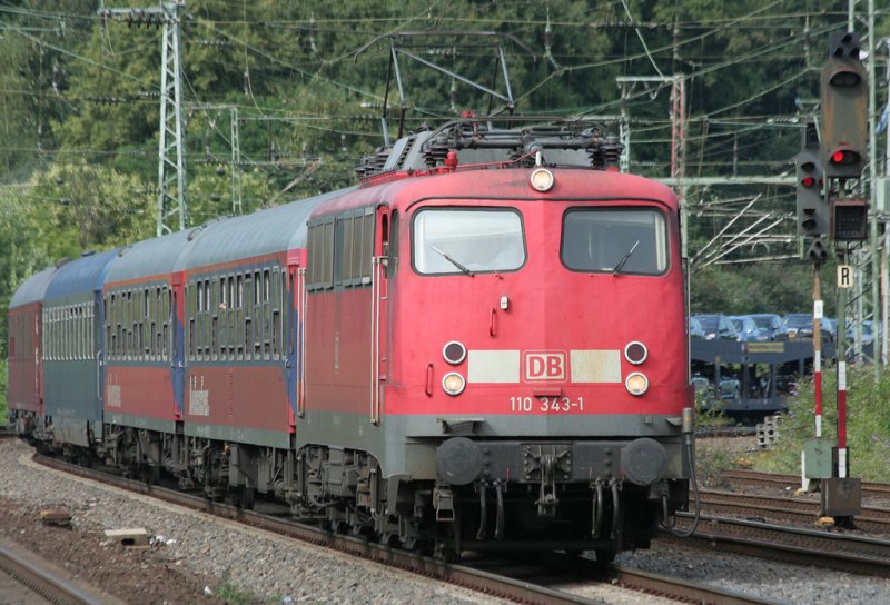 Der Autoslaaptrain mit Schalfwagen aus Venlo wird heute von 110 343-0 (jetzt DB Regio Dortmund) gezogen, aufgenommen bei der durchfahrt in Köln West am 31.07.2009