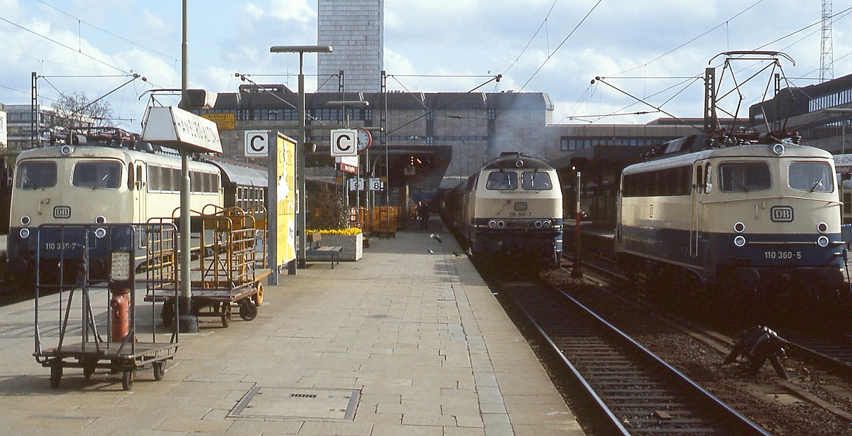 Beige-türkis präsentieren sich die Lokomotiven am 27.04.1985 im Bahnhof Hamburg-Altona: Zwischen 110 359-7 und 110 360-5 verläßt die 218 901-7 den Kopfbahnhof. Bei dieser Lok handelt es sich um eine der früheren Gasturbinenlokomotiven der Baureihe 210, die seit 1983 beim Bw Braunschweig stationiert waren.