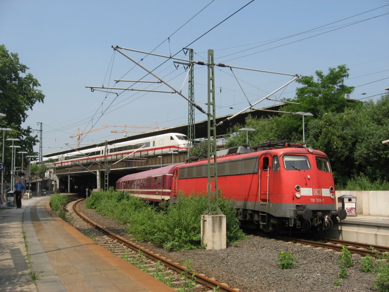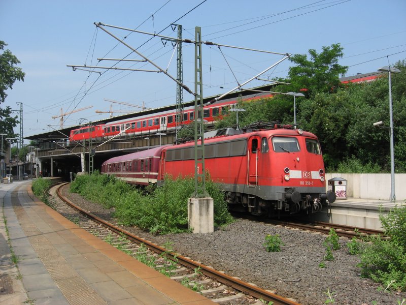 110 359-7 mit einem einem Sonderzug am 24. Mai 2007 in Köln-Messe/Deutz an Gleis 12. Oben fährt durch Gleis 1 ein unbekannter ICE 2 wahrscheinlich aus Bonn in Richtung Berlin.