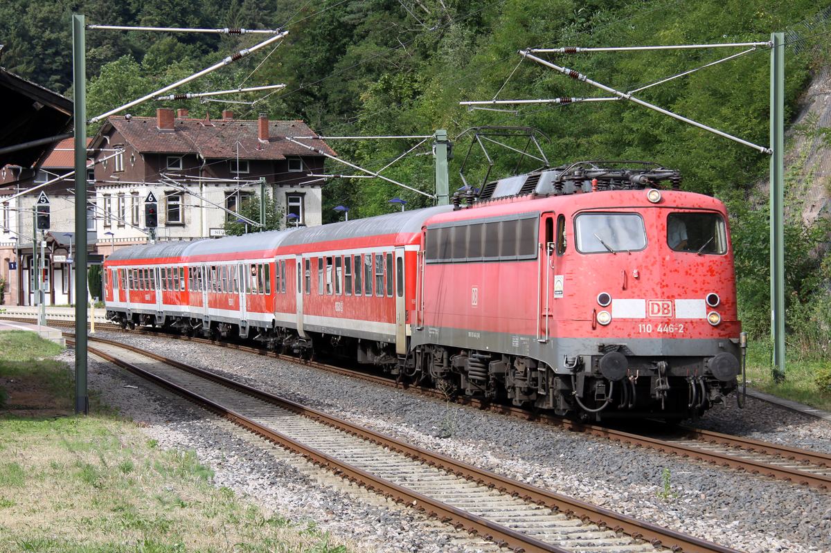 Die letzte DB 110 im Regio Einsatz, die Stuttgarter 110 446-4 sollte am 18.08.2013 das letzte mal den Radl Express als RB von Bad Wildbach nach Stuttgart auf der Enztalbahn ziehen, hier in Neuenbürg, und wieder mal, Bye Bye Regio 10er!