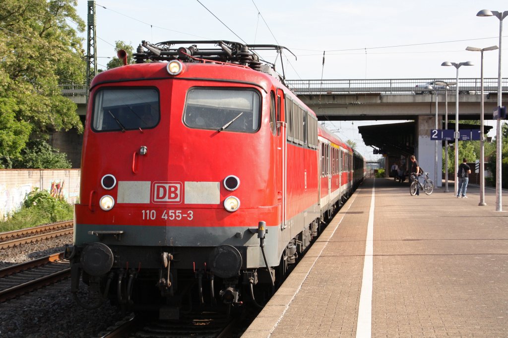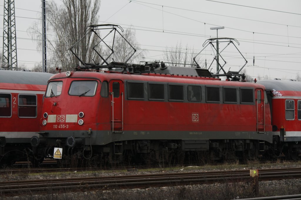 110 455-3 zieht am 28.5.2010 eine RB aus Bremen in den Oldenburger Hbf. Ab Dezember werden diese Züge durch E-Triebwagen der Baureihe 440 von der NordWestBahn ersetzt. Matthias Handschuch