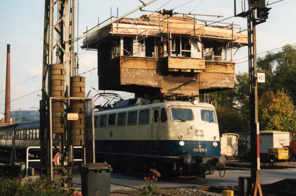 BR 110 475-1 am Bahnübergang Letmathe. Das alte Stellwerk wird abgebaut. Aufnahme vom 15.10.92