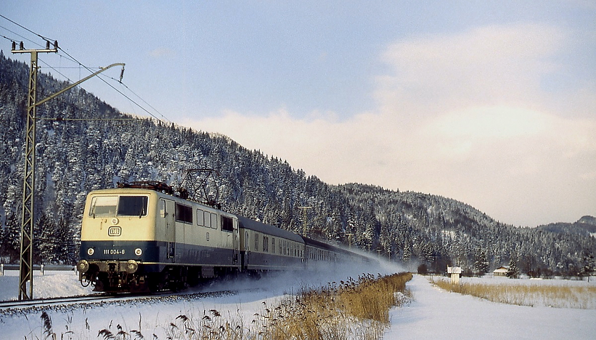 Anfang Januar 1980 hat 111 004-8 gleich ihren Zielbahnhof Garmisch-Partenkirchen erreicht