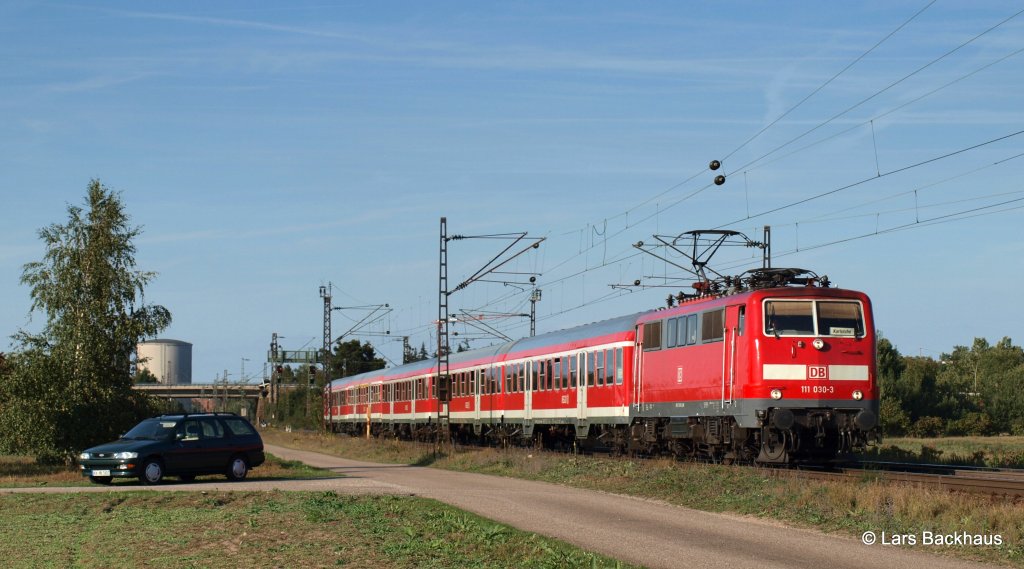 Die Ludwigshafener 111 030-3 mit der RB 38861 (Mannheim-Karlsruhe) am 23.09.2011 bei Waghäusel.