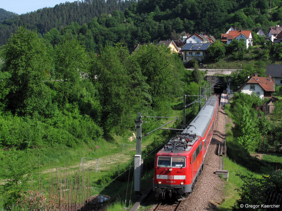 Um die Zuggarnitur des Murgtäler Fahrradexpress wieder aus Freudenstadt rauszubekommen ist eine Rückleistung erforderlich. Im Bild schiebt am 08.05.2011 die 111 030-3 den RE 38958 (Freudenstadt - Ludwigshafen (Rhein)) das Murgtal hinunter. Das Bild entstand beim Einfahrsignal in Forbach (Schwarzwald).