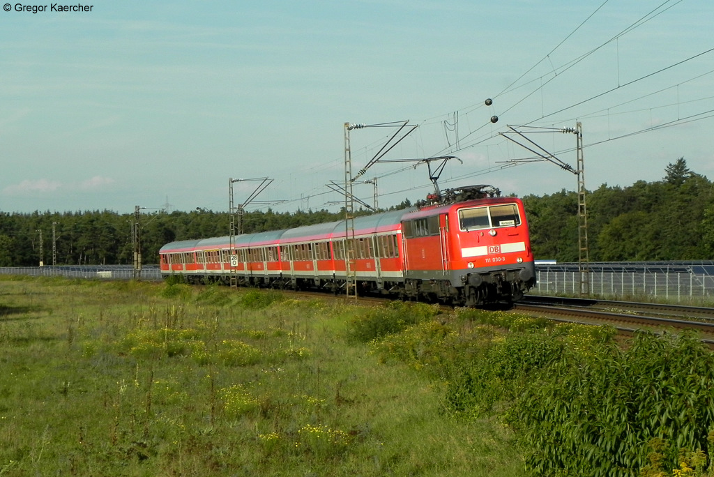 111 030-3 hat soeben mit einem HVZ-Verstärkerzug Waghäusel passiert und wird gleich Wiesental erreichen. Aufgenommen am 23.09.11 bei Waghäusel.