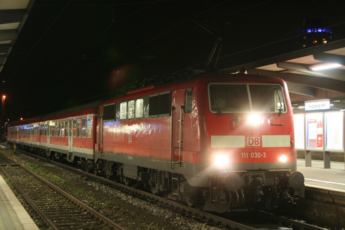 111 030-3 eilt an einem trüben Nachmittag mit ihrer Regionalbahn Richtung Donauwörth. Aufgenommen zwischen Dillingen/Donau und Steinheim.