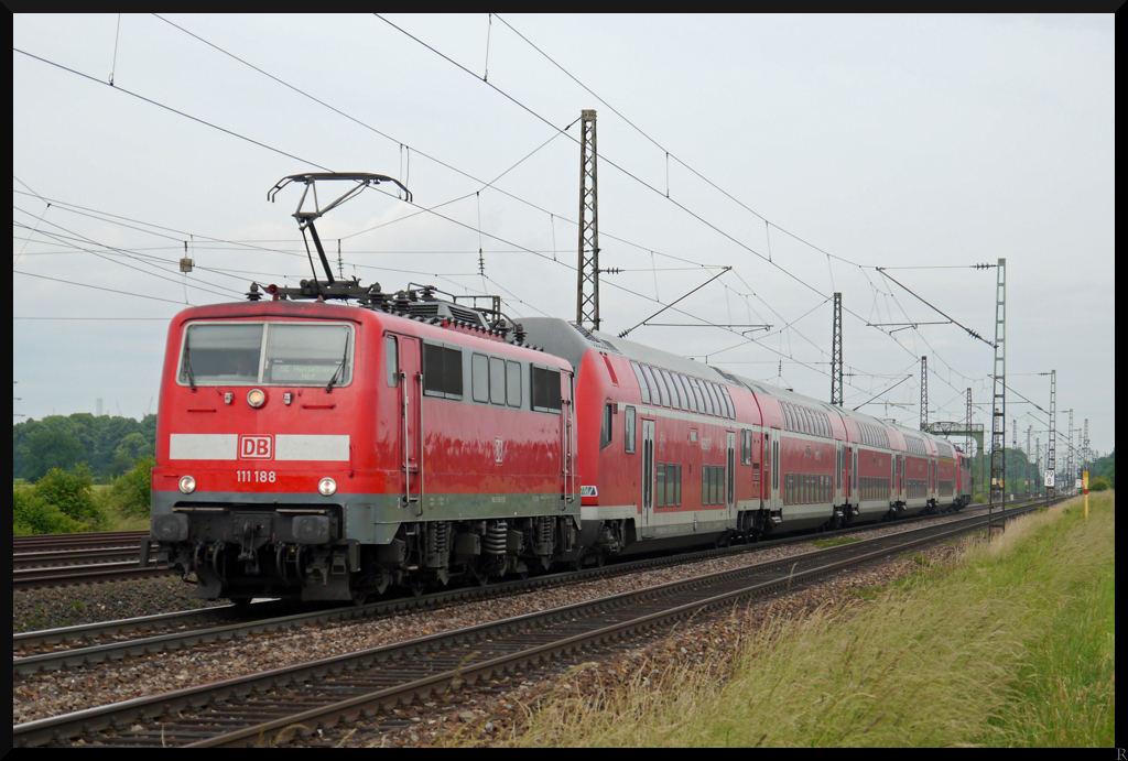 Kurz vor dem Ziel sind 111 188-9 und 111 094-9 am Schluss mit einen SE nach Heidelberg. (15.06.2013)