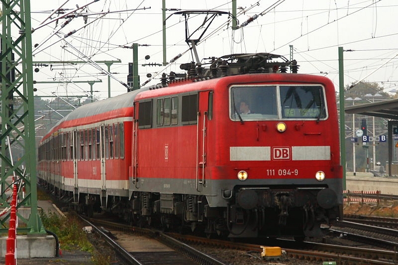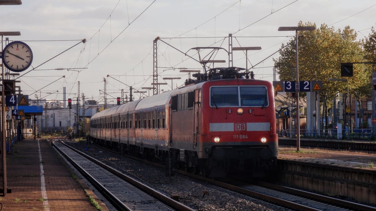 Die BR 111 094-9 als Regionalexpress nach Frankfurt Hauptbahnhof. Aufgenommen am 26.10.2009 am Bahnhof Frankfurt Stadion am Bahnsteig 1.