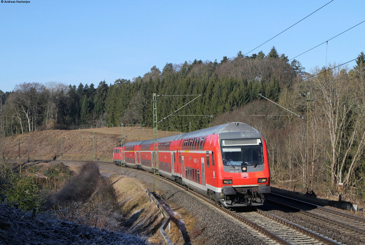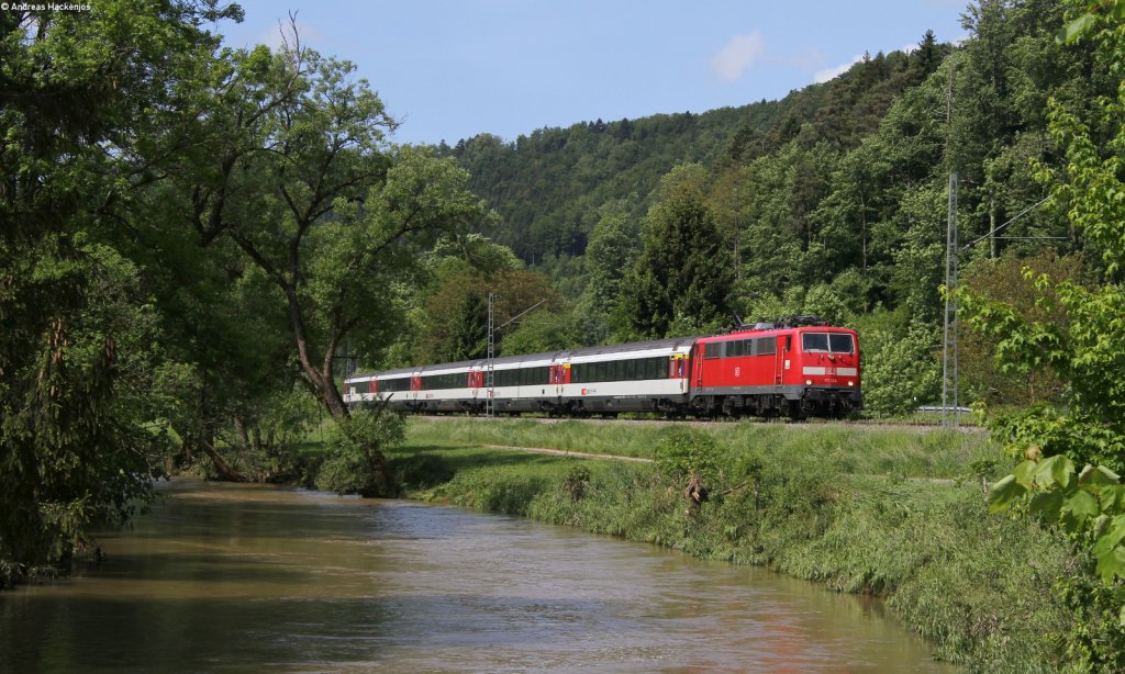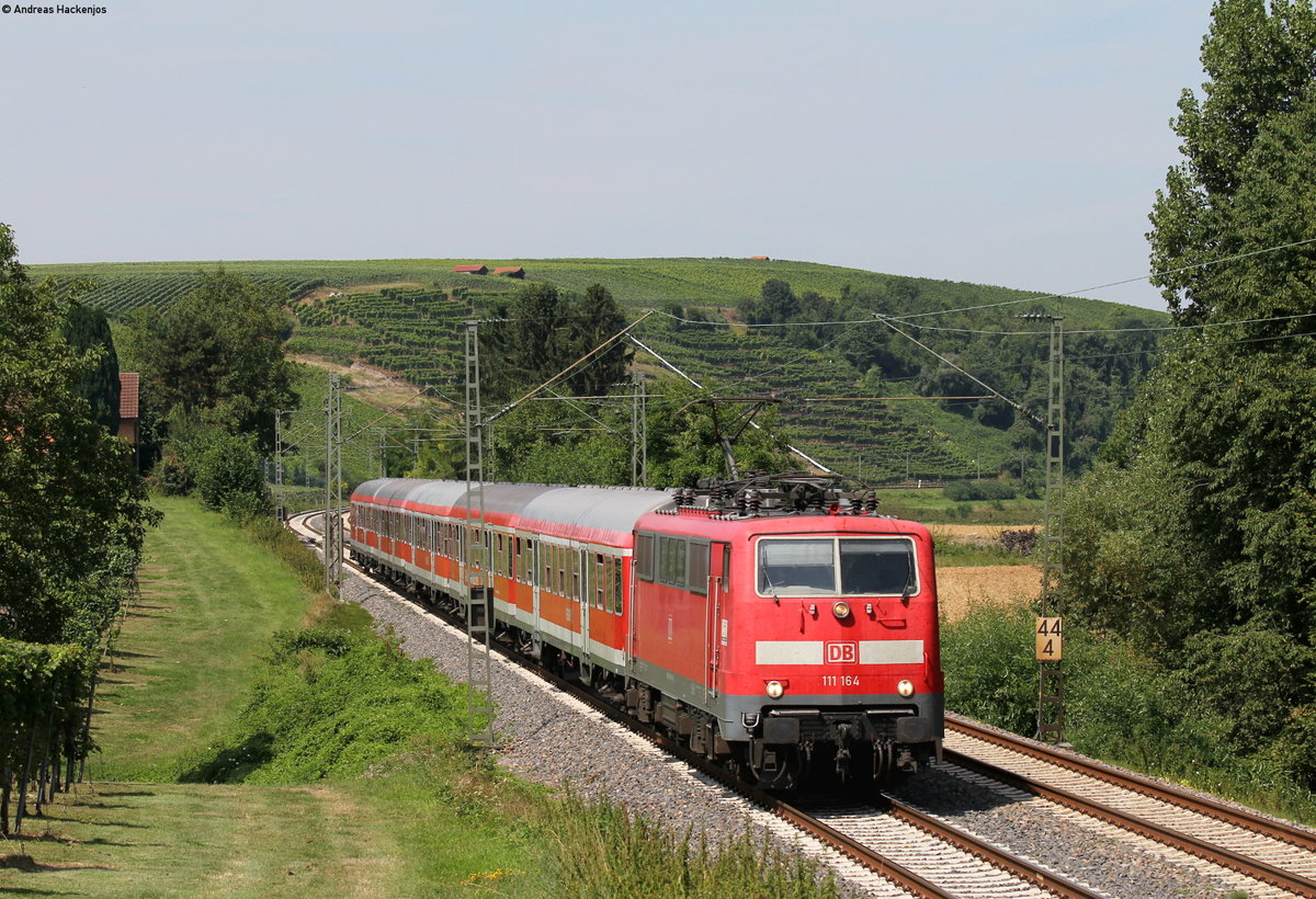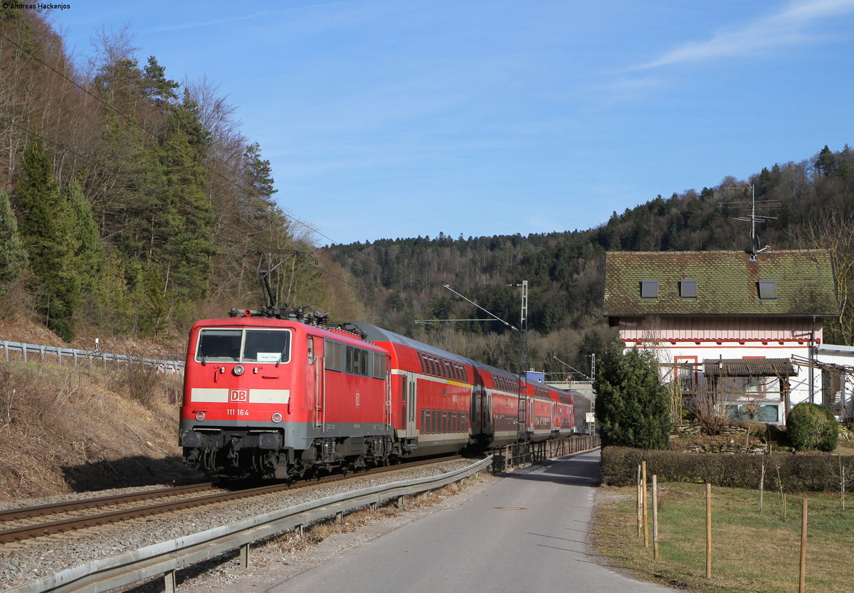 Am Morgen des 3.04.2008 zog 111 164-0 einen der wegen der Streckensperrung der Murrbahn umgeleiteten RE´s von Nürnberg Hbf nach Stuttgart Hbf. Hier kurz nach dem Halt in Goldshöfe aufgenommen. Johannes Uhl