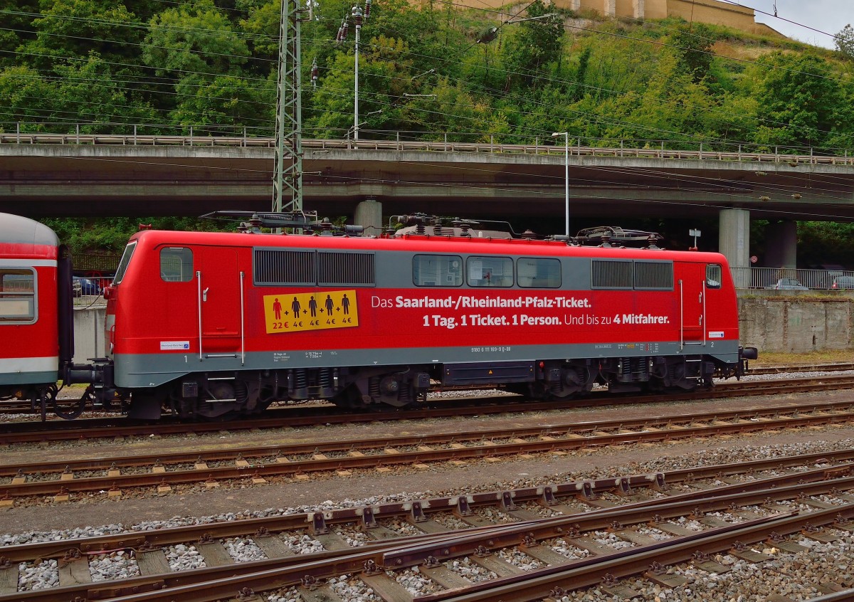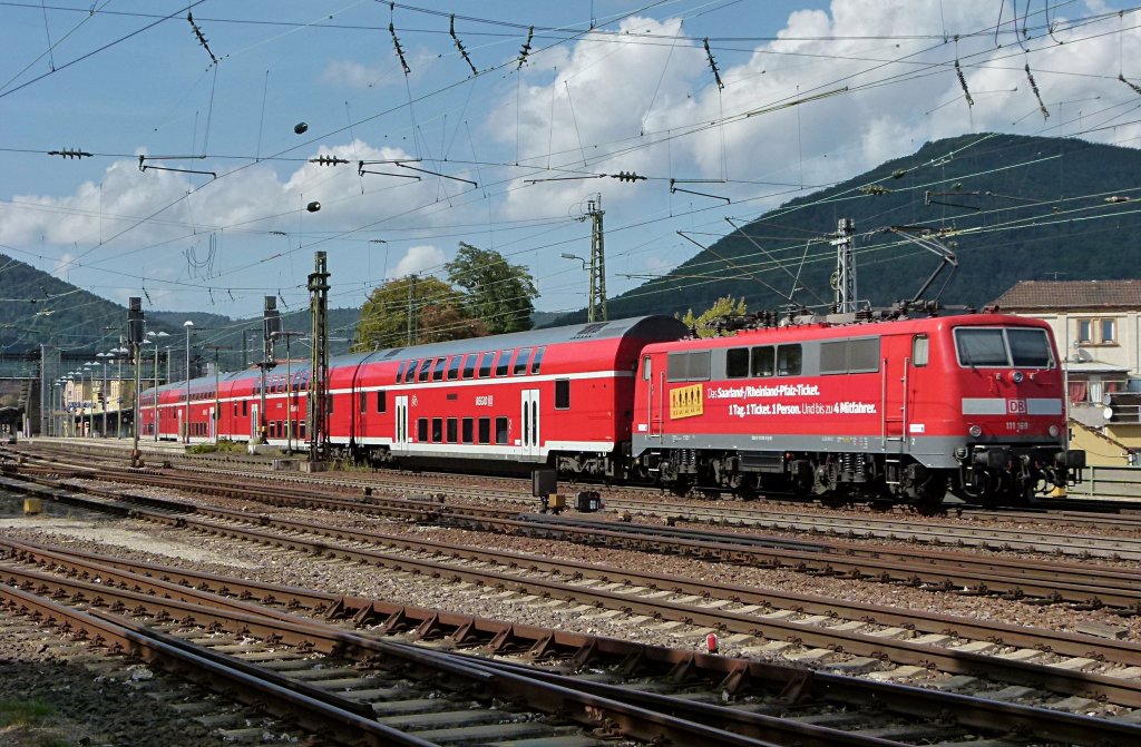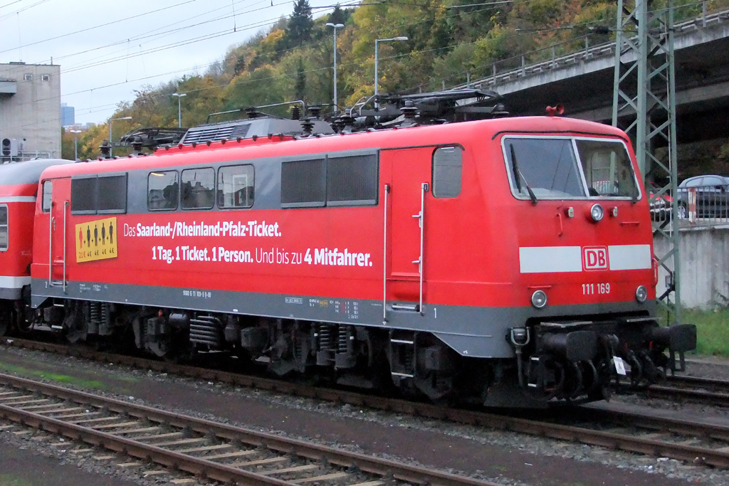 Breitseite der 111 169-9 in Koblenz am 21.9.2013 abgestellt mit einem N-Wagenzug.
