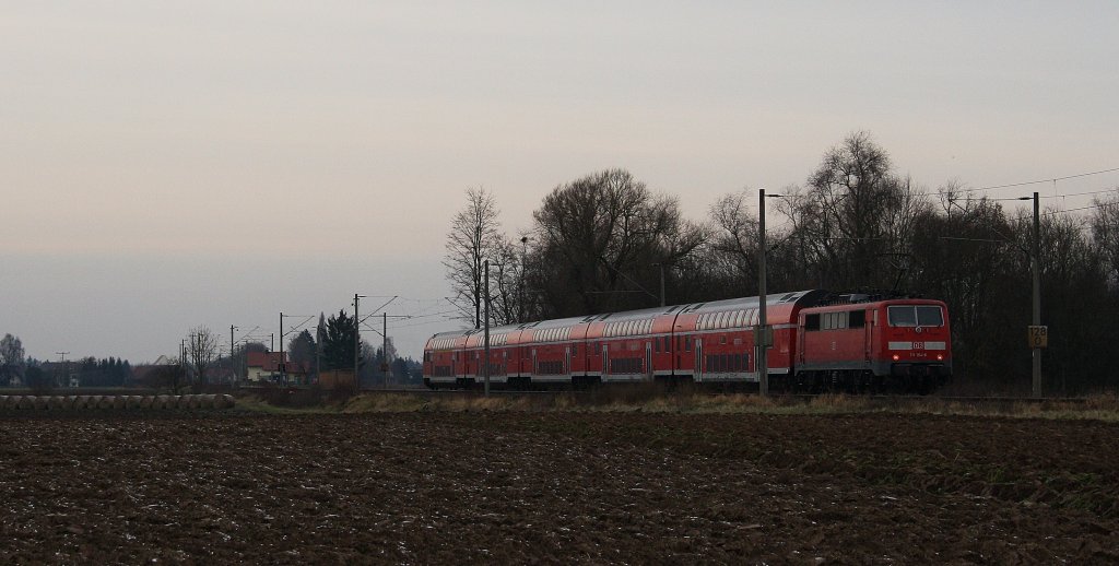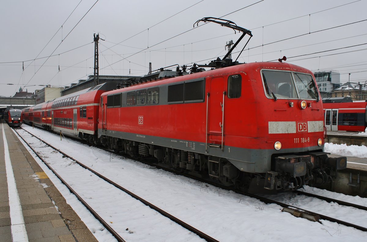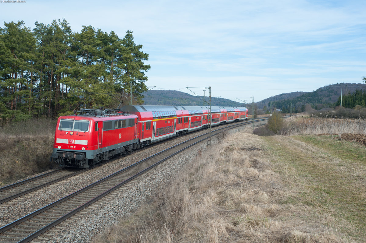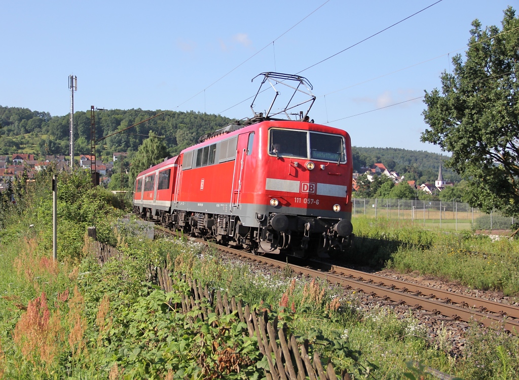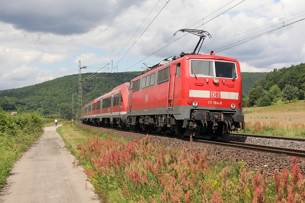 Eine aus drei n-Wagen und 111 184-8 gebildete Regionalbahn von Kronach nach Bamberg steht am 18. Juli 2014 im Haltepunkt Redwitz (Rodach). Frankenwaldbahner