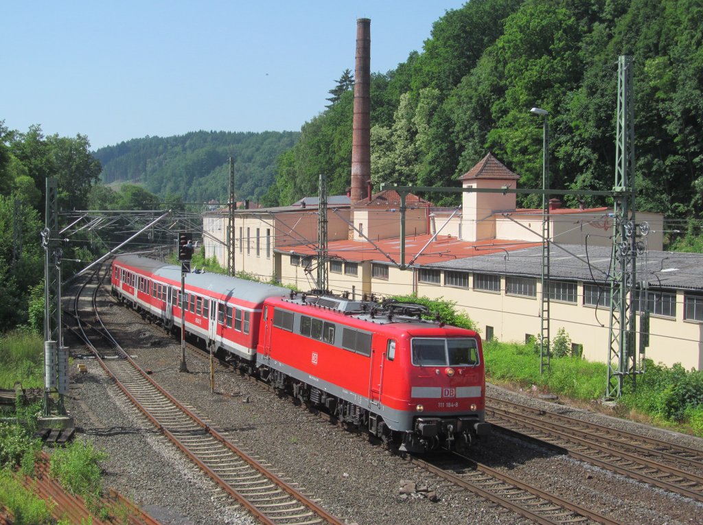 111 184-8 überquert am 18. Juli 2014 mit einer morgendlichen Leerreise von Bamberg nach Ludwigsstadt die Trogenbachbrücke in Ludwigsstadt. Frankenwaldbahner