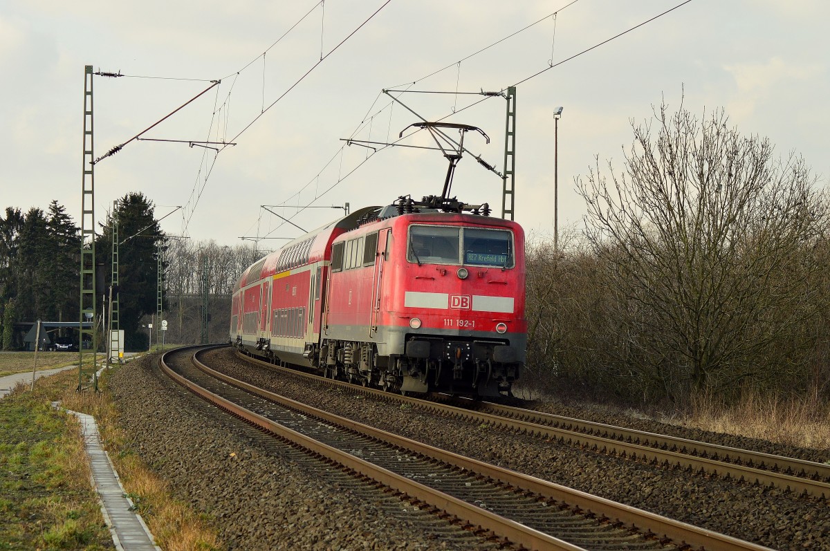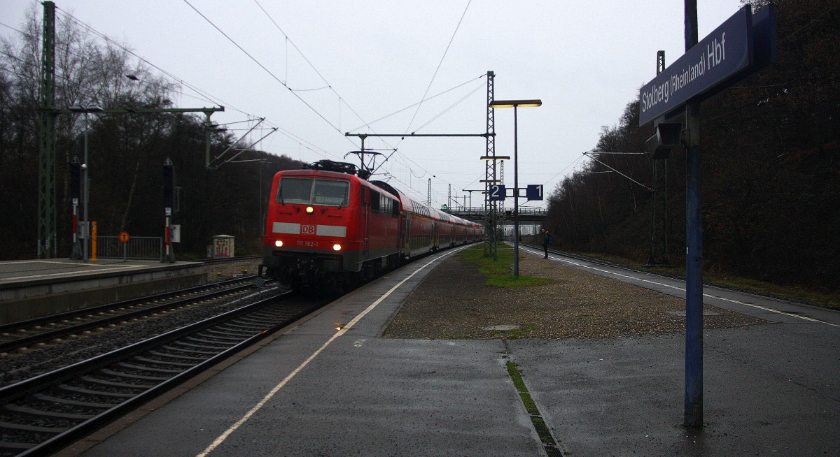 Ein Nachschuss von der 111 192-1 DB schiebt den RE1 aus Paderborn Hbf-Aachen-Hbf und hilt im Stolberger-Hbf bei Regenwetter am Kalten 13.12.2014. Stefan Hochstetter