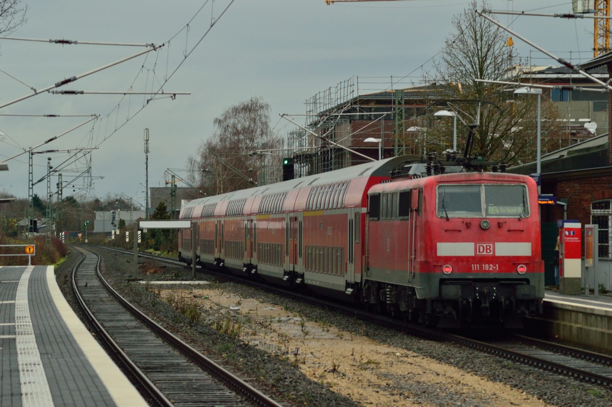 111 192-1 DB kommt aus Richtung Aachen-Hbf-Aachen-Rothe-Erde-Eilendorf mit dem RE1 aus Aachen- Hbf nach Paderborn-Hbf und hält in Stolberg-Hbf-Rheinland und fährt in Richtung Eschweiler-Hbf-Köln bei Regenwetter am Kalten vom 13.12.2014. Stefan Hochstetter