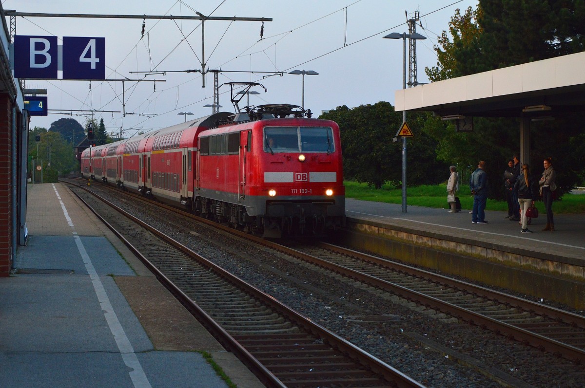 Einen RE4 am Haken hat die 111 192-1 als sie am Abend des 30.9.2014 in Rheydt Hbf einfährt, auch heute geht es auf Grund von Bauarbeiten nur bis Erkelenz. Andreas Strobel
