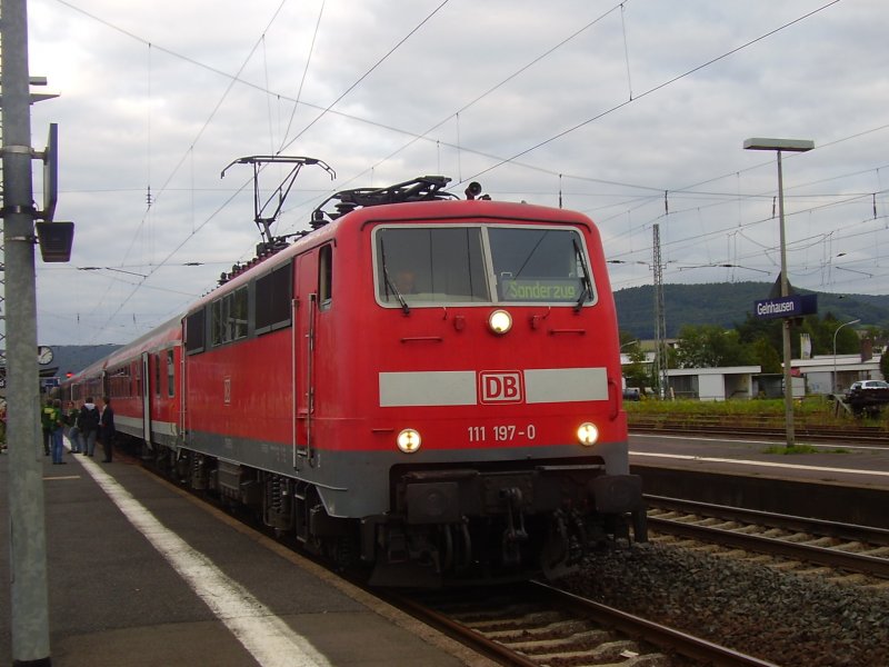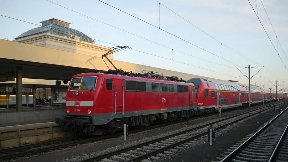 111 197-0 und 111 110-3 ziehen/schieben im Sandwich-Verkehr planmäßig die RE´s nach Frankfurt und zurück. Die Kombination von Lok und Steuerwagen ist dabei auch planmäßig zu sehen. (12.12.12) trainhero