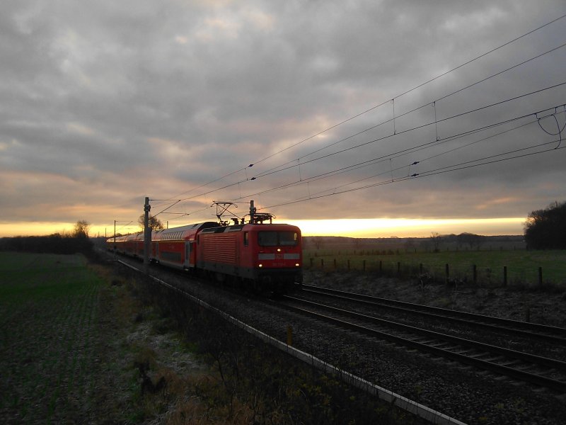 112 132-2 rast am Morgen des 27.12.08 kurz nach Sonnenaufgang mit RE 21411 Lübeck Hbf - Hamburg Hbf Richtung Reinfeld (Holst.) um dort eien Planhalt einzulegen. Lars Backhaus