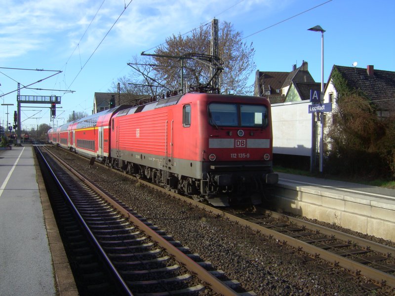 112 135-9 schiebt am 11.02.08 den RE 11 nach Düsseldorf aus dem Bahnhof Lippstadt.