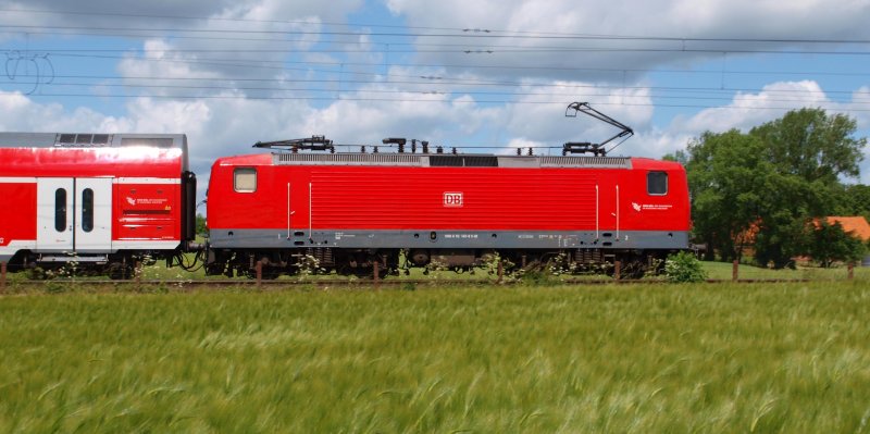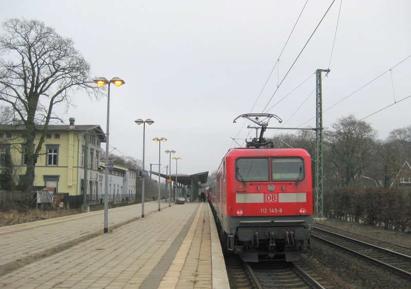 Frontschuss auf die 112 145-8 mit RE 21575 Lübeck Hbf - Hamburg Hbf hier kurz vor Reinfeld (Holst.). Aufgenommen am 18.02.09 von einer Feldwegquerung in Altenfelde. Lars Backhaus