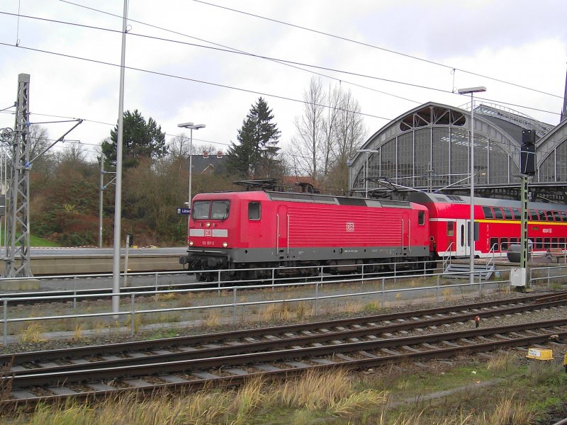 112 157-2 zieht am 20.12.08 den Leerzug des RE 21414 aus Hamburg Hbf aus dem Lübecker Hbf in die Abstellgruppe zur Innenreinigung.
