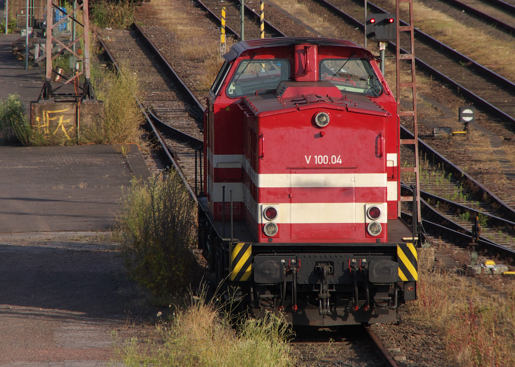 V 100.04 gehört der Hessischen Güterbahn. Die Lok wurde im Jahr 1971 als 110 374-6 in Dienst gestellt. Die Deutsche Reichsbahn nahm noch einen Umbau vor, danach hieß sie   112 374-4  . Nach der  Wende  lief sie als   202 374-5  .