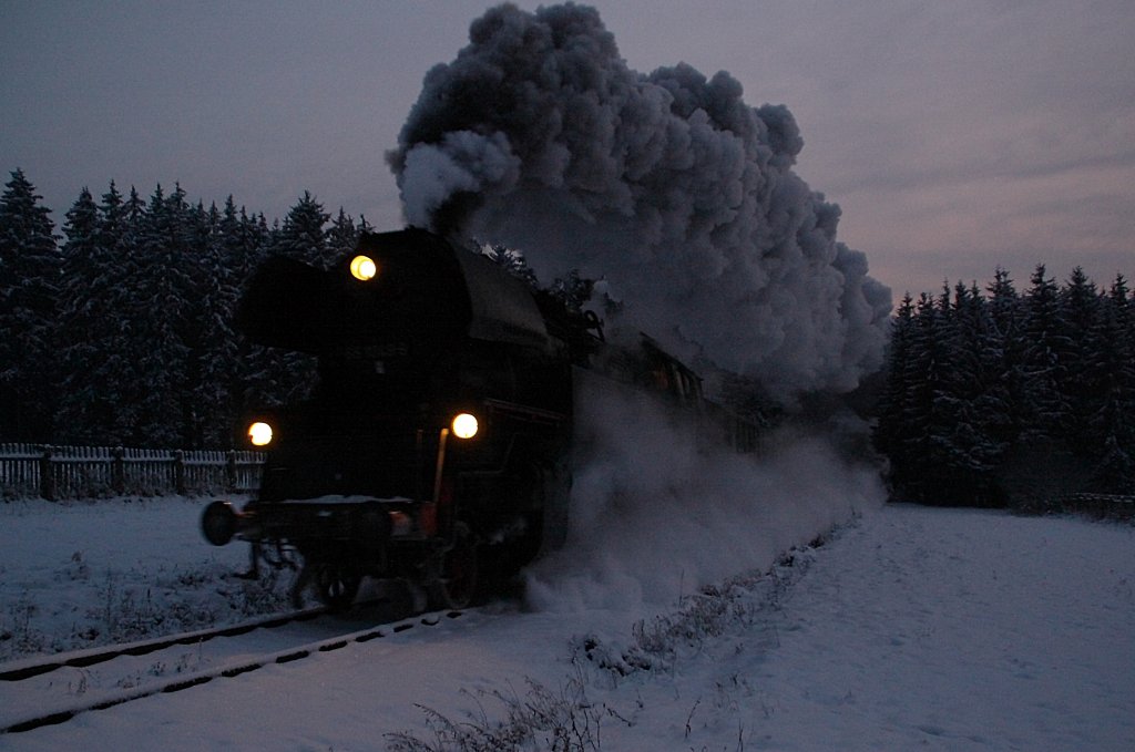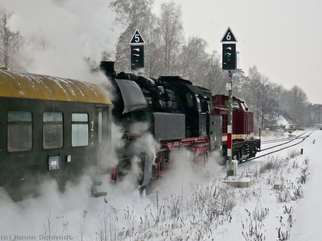 112 646-5 und 65 1049 schleppen einen Dampfsonderzug aus dem Bahnhof Ronneburg (Thür) heraus in Richtung Gera. (19.12.2009)