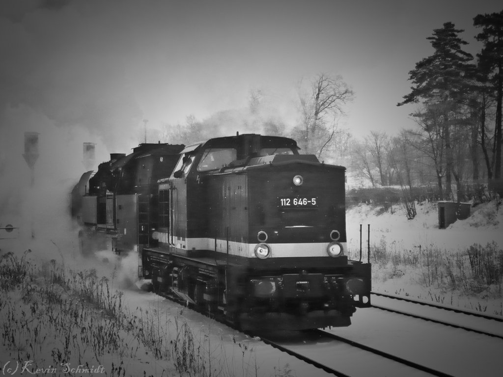 Hier mein Versuch einer kleinen Vorweihnachtsfreude für alle (N)Ostalgie-Freunde, der mir hoffentlich geglückt ist: 112 646-5 zieht einen Dampfsonderzug mit der Dampflok 65 1049 aus dem Bahnhof Ronneburg (Thür) in Richtung Gera. (19.12.2009)