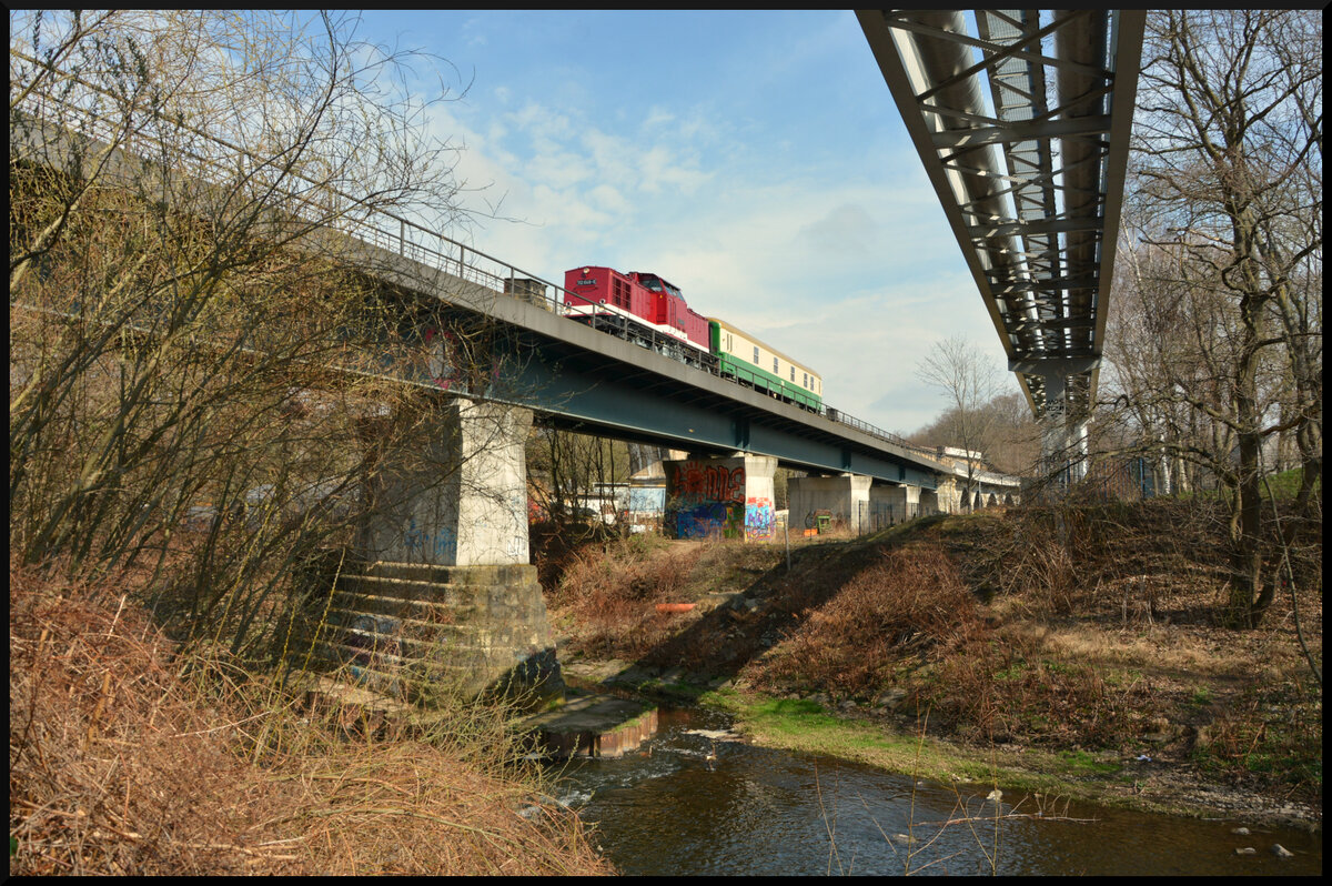 Hoch über der Chemnitz: Die Diesellok 112 646-5 (Triangula Logistik TRG) überführte am 23.03.2025 den ehemaligen Postwagen 60 80 99-25 411-2 (ebenfalls TRG) von Zwönitz über das Chemnitzviadukt nach Chemnitz Küchwald. Am Vortag waren die Lok und der Waggon mit einem Sonderzug zwischen Zwönitz und Schlettau im Erzgebirge unterwegs gewesen.
