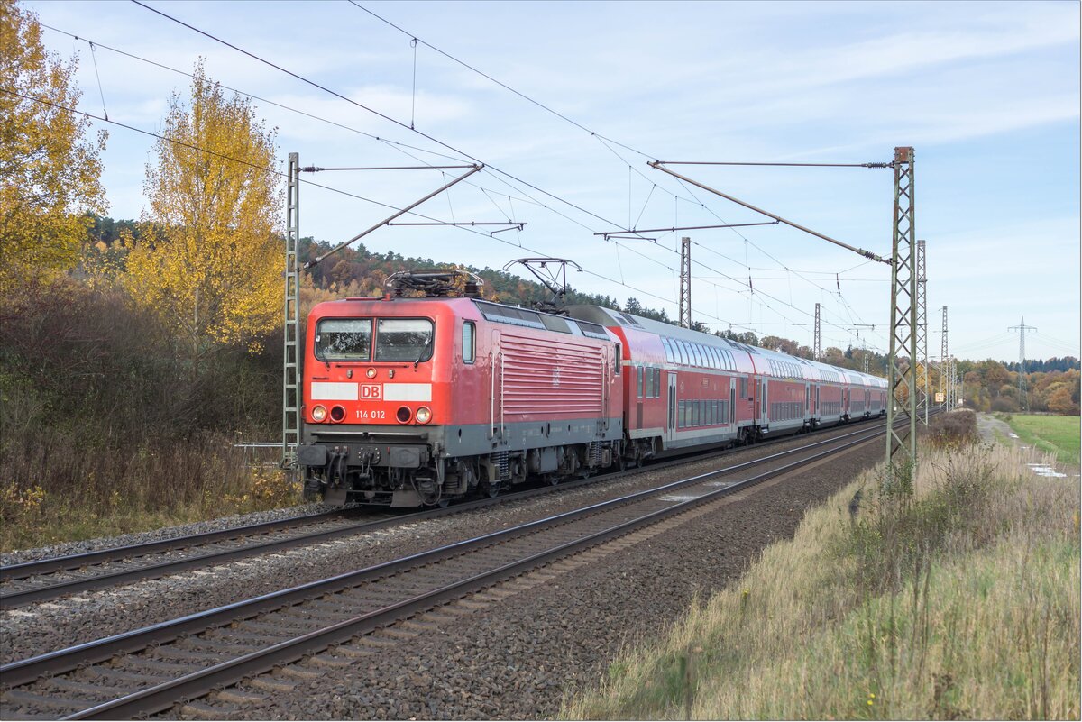 114 012-8 mit dem RE 3 (RE 18313) nach Elsterwerder am 02. Februar 2012 zwischen Bahnhof Berlin-Lichterfelde Ost und dem Bahnhof Blankenfelde(Teltow-Fläming) bei km 24.2 auf dem südlichen Berliner Außenring bei Diedersdorf. Klaus-P. Dietrich