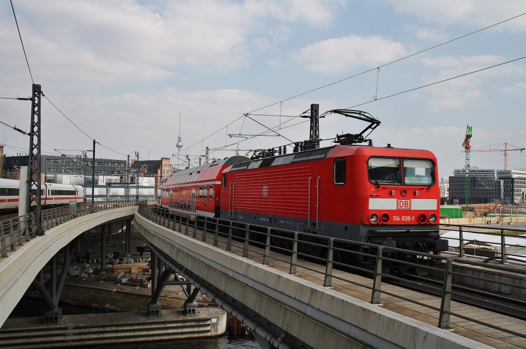 Die Dresdnerin 143 585-8 kommt mit der Cottbuserin 114 039-1 (kalt) durch den Berliner Hbf gefahren. Ziel der beiden Loks ist mir unbekannt. 26.04.2012 Stephan Kemnitz