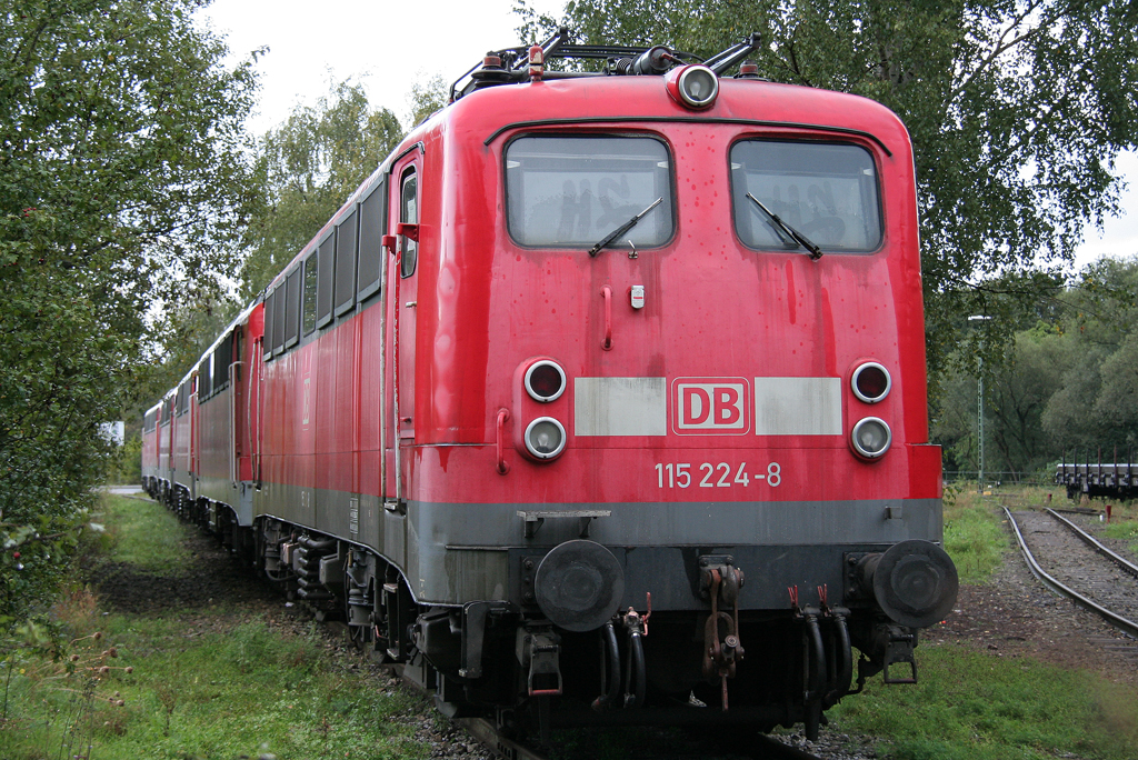 Die 115 159-6, 115 355-0, 115 230-5, 115 148-9, 115 224-8 stehen kurz vor ihrer letzten Reise (einmal über die Straße) vor den Toren des Theo Steil in Eschweiler Aue am 17.09.2011 Adioz gute alte Einheitslok!