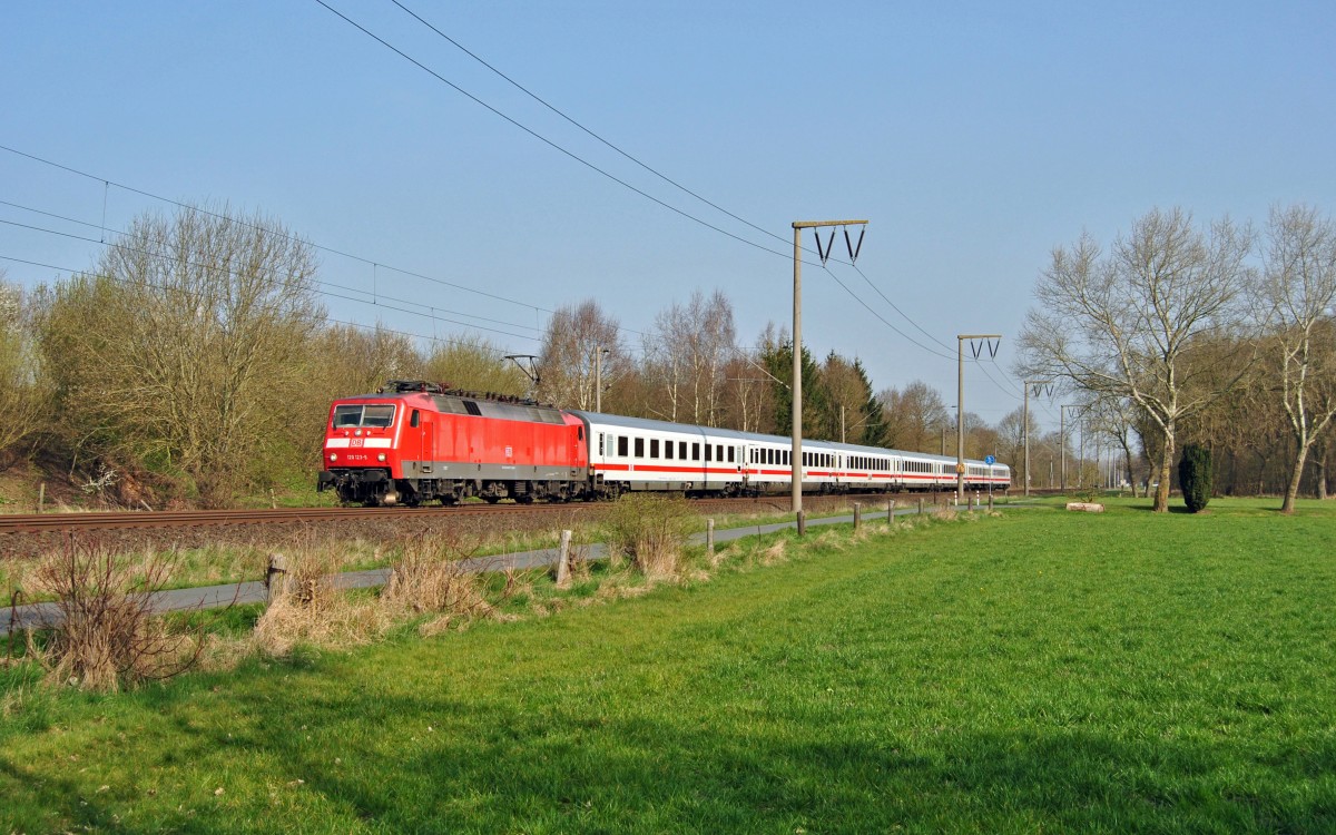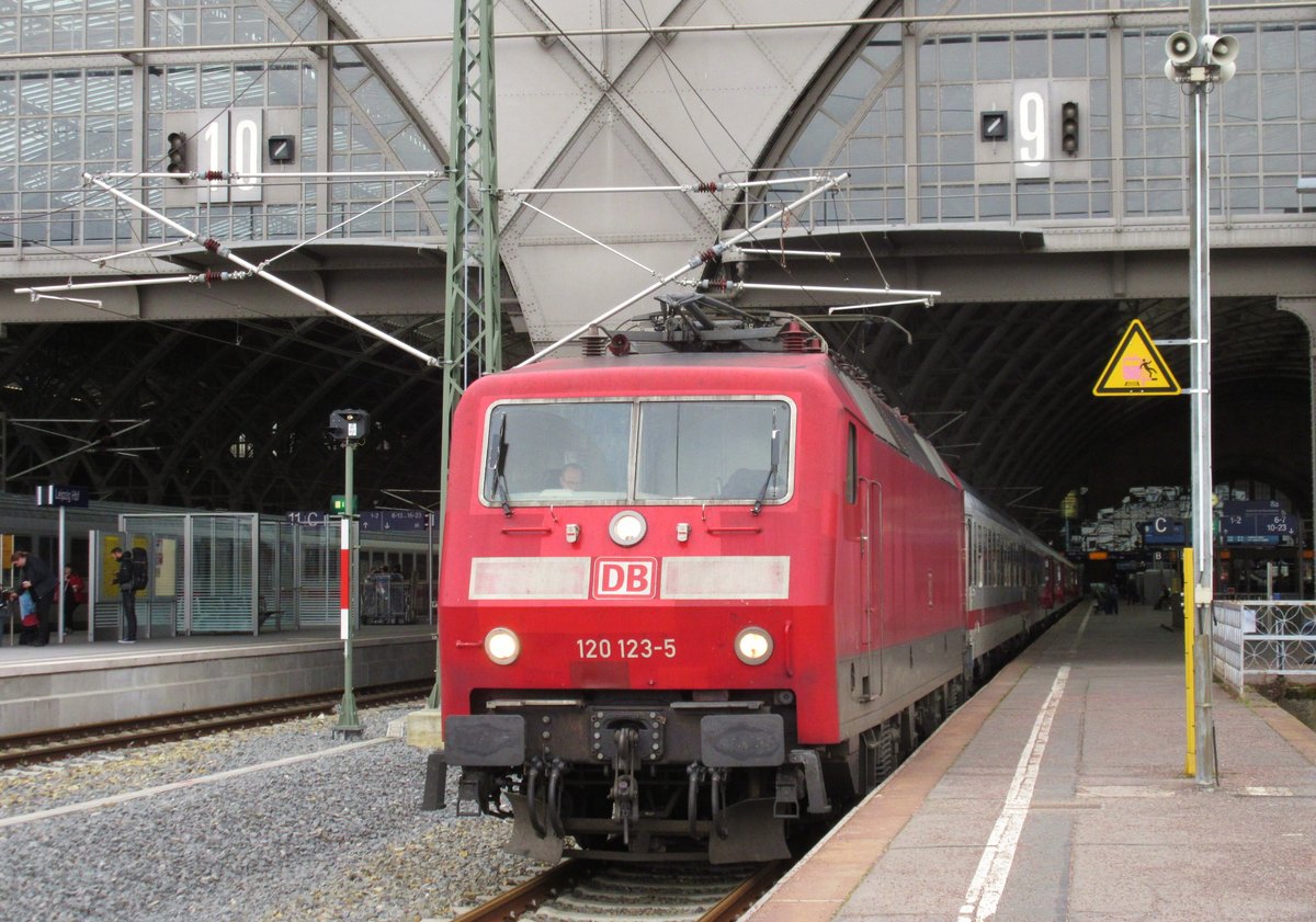 Blick auf 120 123-5 DB, die im PbZ 2487 von Leipzig Hbf nach Frankfurt(Main)Hbf mit 120 105-2 DB eingereiht ist und in Zscherben, Angersdorfer Straße, auf der Bahnstrecke Halle–Hann. Münden (KBS 590) fährt.