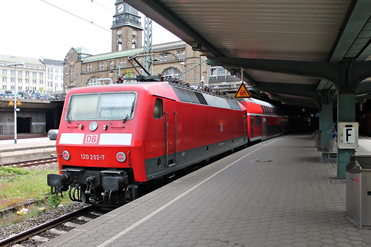 Am 25.05.2015 stand 120 202-7 (ex. 120 129-2) mit einem RE1 (Hamburg Hbf - Rostock Hbf) im STartbahnhof und wartet auf ihre Abfahrt.