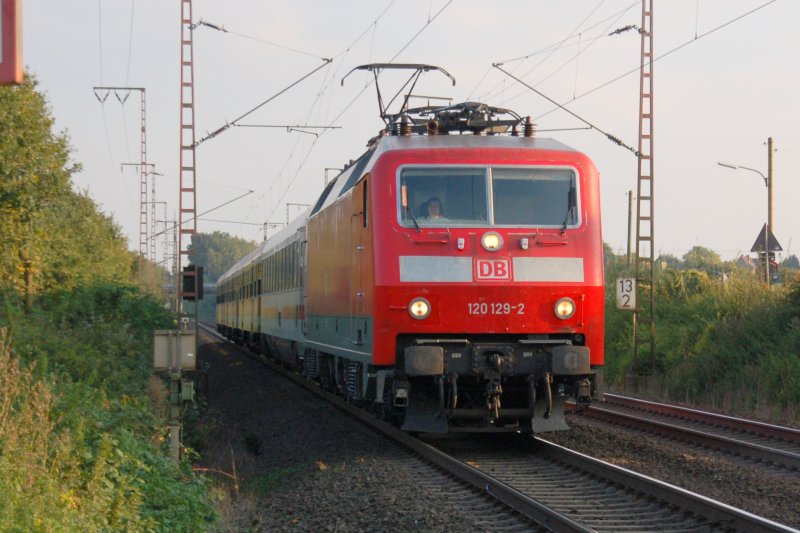 DB Elok 120 129-2 mit IC am frühen Abend des 16.09.2007 in Recklinghausen am Bahnübergang Börster Weg.