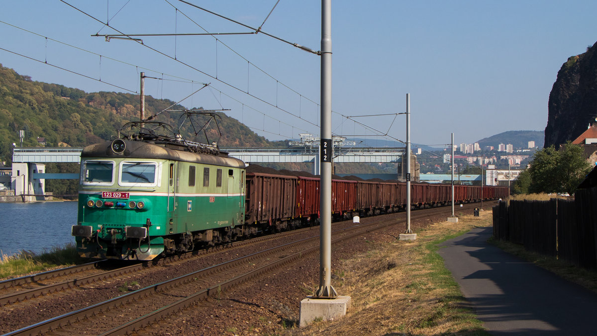 123 029-1 zu sehen mit einem Kohlenzug am 28.09.14 in Ústí nad Labem-Střekov.